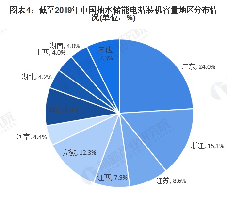 目前,我国已建和在建抽水蓄能电站主要分布在华南、华中、华北、华东等地区,以解决电网的调峰问题。据统计,2019年,广东、浙江、江苏三省的装机比例最大,占比分别为24%、15.1%、8.6%。