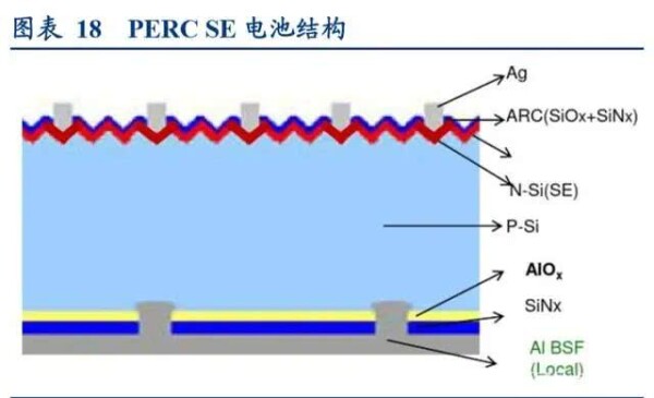 PERC+SE 技术带来 0.2%~0.3%的转换效率提升,与现有 PERC 产线兼容性较高,已成为主流标配技术:PERC+SE 技术以扩散后的 PSG 层为磷源,利用激光可选择性加热的特性,在电池正表面电极位置进行磷的二次掺杂,形成选 择性重掺 N++层,可降低硅片与电极之间的接触电阻,降低表面复合,提高少子寿命,同时还能改善光线短波光谱 响应,提高短路电流与开路电压,进一步提升电池效率。相比 PERC,SE 技术可带来 0.2%~0.3%的转换效率提升。